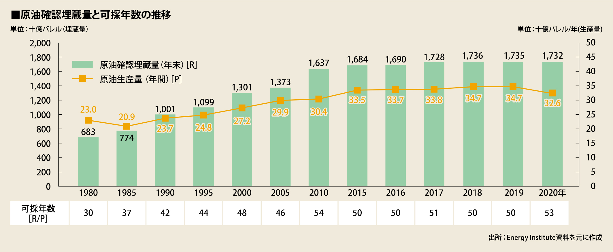 可採年数は、技術革新による採掘方法の進歩や新規油田の発見、油価上昇による採算性の向上等から増加するもので、原油価格や統計の取り方によっても変動する数値です。