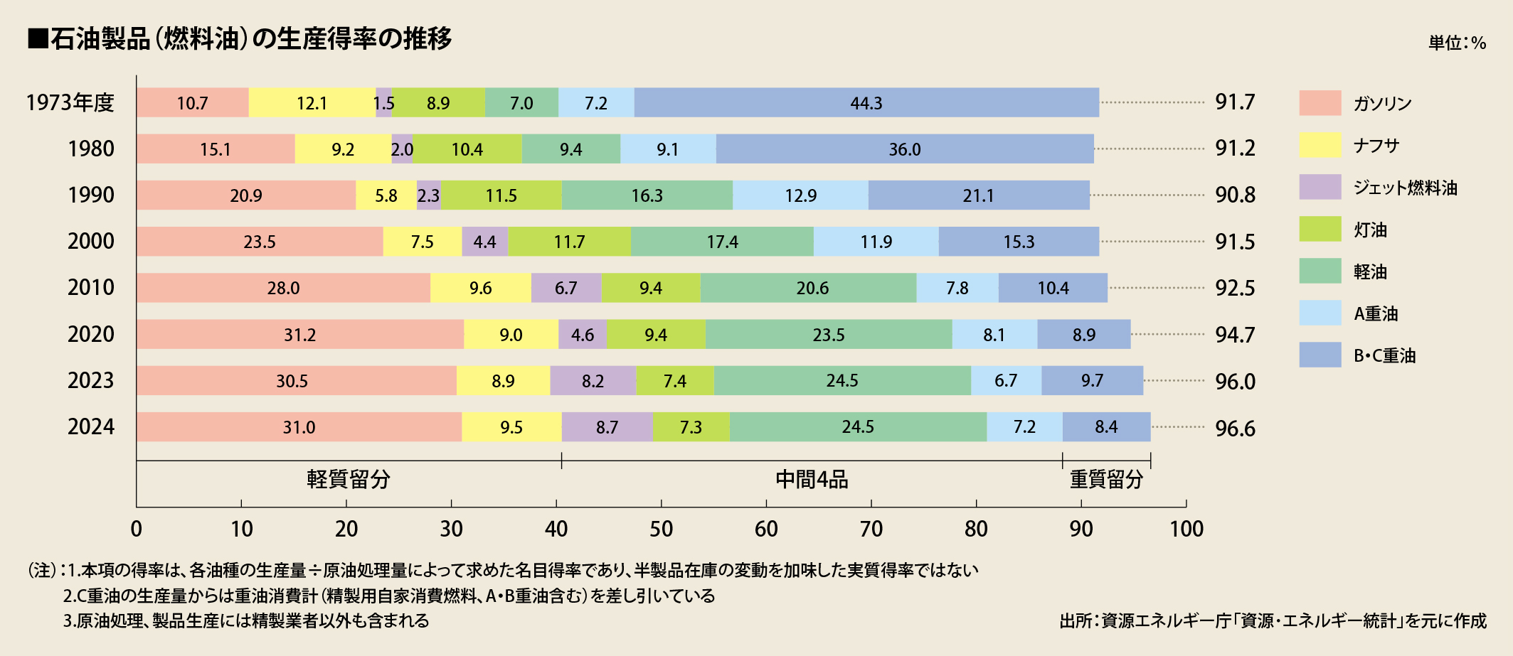 石油は、原油から複数の製品(ガソリン、灯油、軽油、重油など)がある程度の割合で同時に生産されるという特性があり、これらの製品を「連産品」といいます。原油の種類によって、生産される製品(留分)の割合(得率)は異なりますが、原油からガソリンだけ、灯油だけを生産することはできません。一方、需要はガソリン、灯油、軽油などのいわゆる「白油」の割合が増加しています。そのため、石油会社は国内の石油製品の需要構成に合わせて生産するために、次のような対応を行っています。