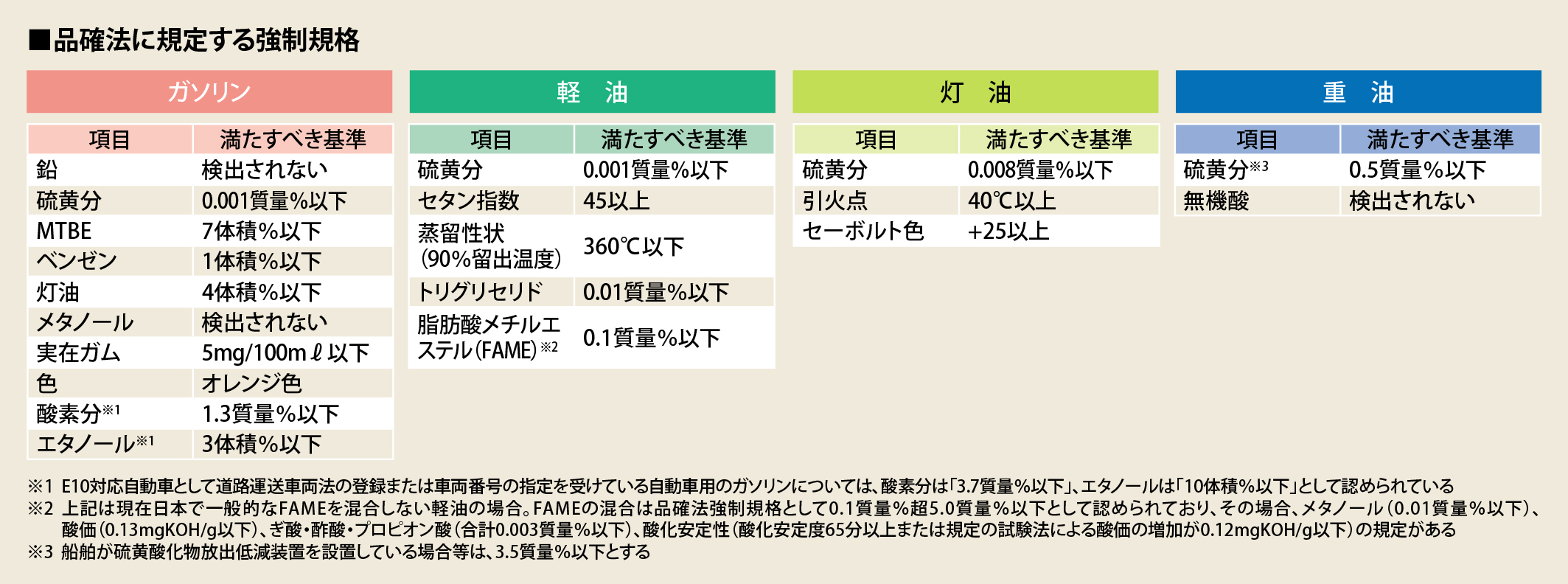 1996年3月末に特定石油製品輸入暫定措置法(特石法)が廃止され、石油製品の輸入が自由化されました。このため、すでに世界的に高水準であったわが国のガソリン、灯油、軽油の品質を輸入品においても維持するために、従来の「揮発油販売業法」は「揮発油等の品質の確保等に関する法律」(品確法)に改正されて、環境・安全面からの品質基準(強制規格)が法的規制として定められ、石油精製業者や輸入業者、販売業者にそれらの維持義務が課されました。