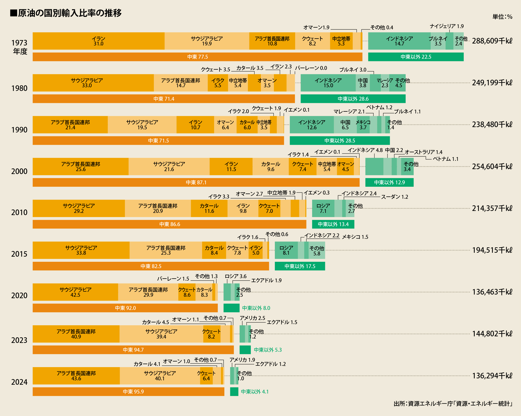 2024年度の原油輸入量は、前年度比5.9%減の1億3629万㎘となりました。原油の輸入元を地域別に見ると、中東地域が95.9%を占めています。国別では、輸入量の多い順に、アラブ首長国連邦(全輸入量の43.6%)、サウジアラビア(同40.1%)、クウェート(同6.4%)、カタール(同4.1%)となっており、上位2か国で全輸入量の約8割以上、4か国で9割以上を占めています。