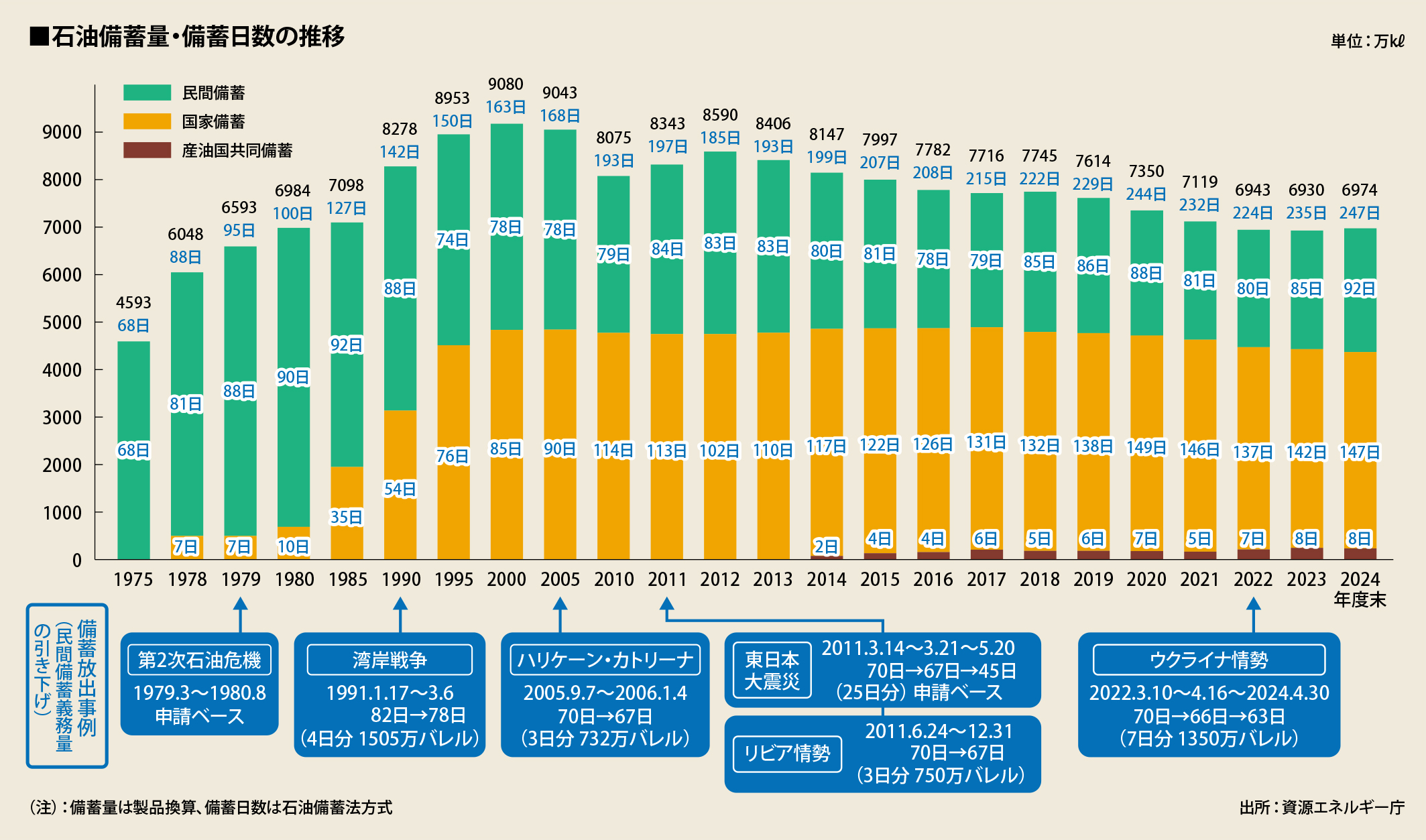 また、78年には、石油公団(現(独)JOGMEC)による国家備蓄が開始され、98年2月には5千万㎘の備蓄目標が達成されました。また、この間に国家備蓄基地が全国に10か所建設されました。こうした国家備蓄の充実によって、89年度以降、民間備蓄は毎年度4日分ずつ軽減されることとなり、93年度からは70日備蓄体制(民間備蓄義務量70日分)となりました。2015年度からは国家備蓄の備蓄水準についても数量ベースから日数ベースへと考え方が改められ、産油国共同備蓄の2分の1と合計して純輸入量の90日分程度の量を確保することとされました。